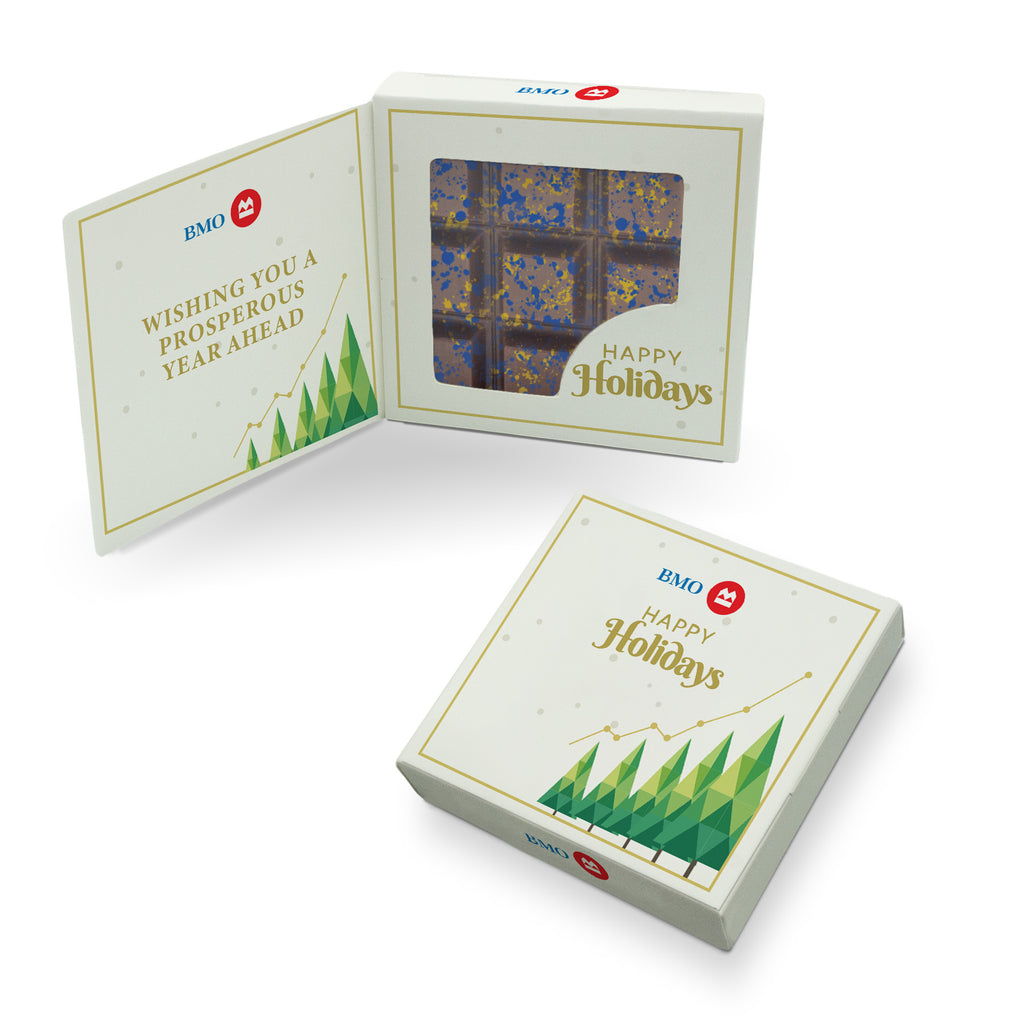 A greeting card paired with hand-splattered Belgian chocolate. This fully customizable card opens to reveal a Belgian chocolate splatter bar, available in milk or dark chocolate. The bar is finished by hand with two splatter colours of your choice from a palette of 18, allowing you to match your brand or design. With plenty of space for your logo, message, or artwork on the outside, it’s a unique, thoughtful, and delicious way to make your brand stand out.