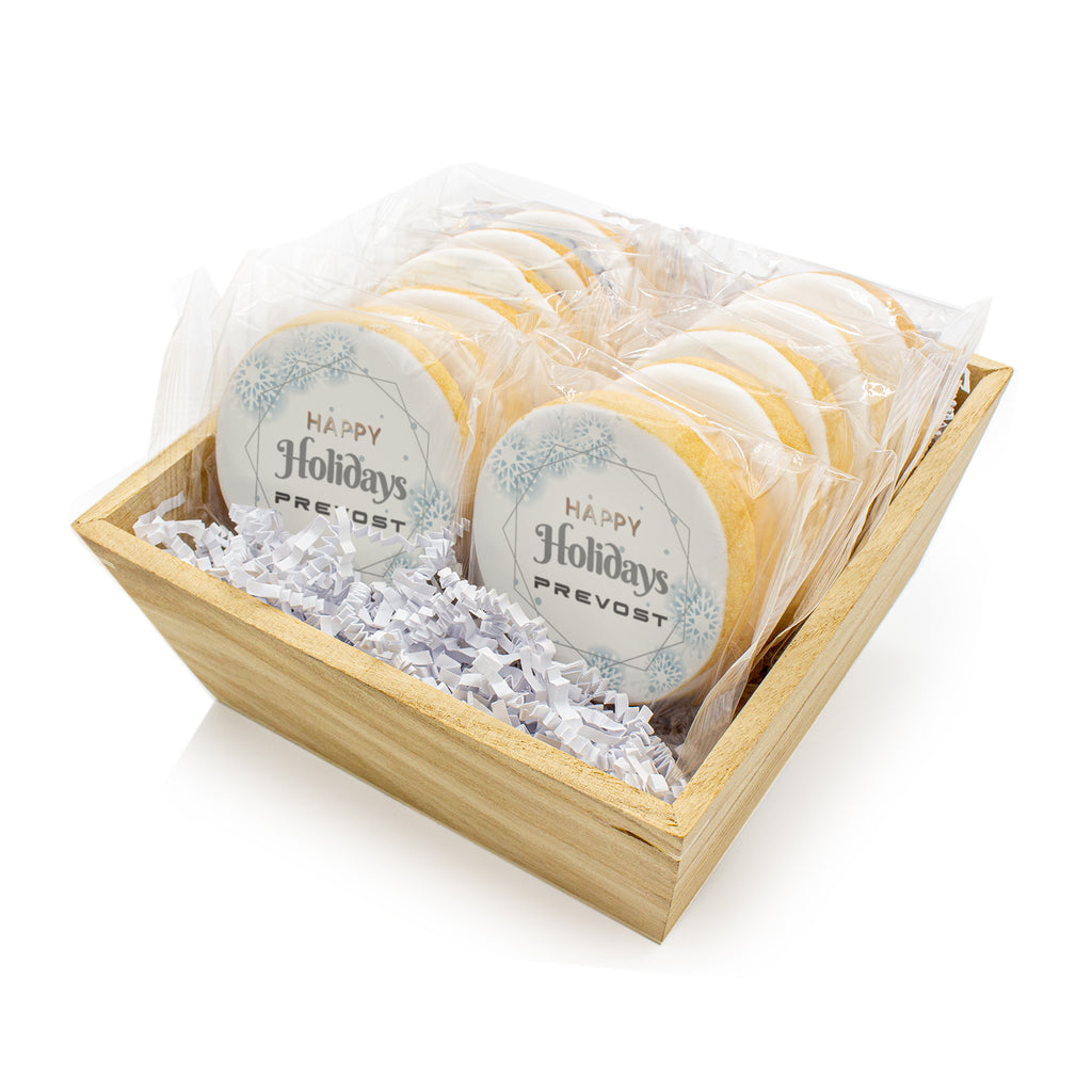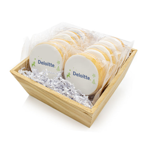 Generous, thoughtful, and perfectly giftable. This wooden gift crate holds twelve of our classic all-butter shortbread cookies—round or square—each finished with royal icing and printed with your logo or design in edible ink. The keepsake crate elevates presentation and makes your gift feel as special as the cookies inside, ideal for client/staff appreciation, holiday gifting, or milestone celebrations.